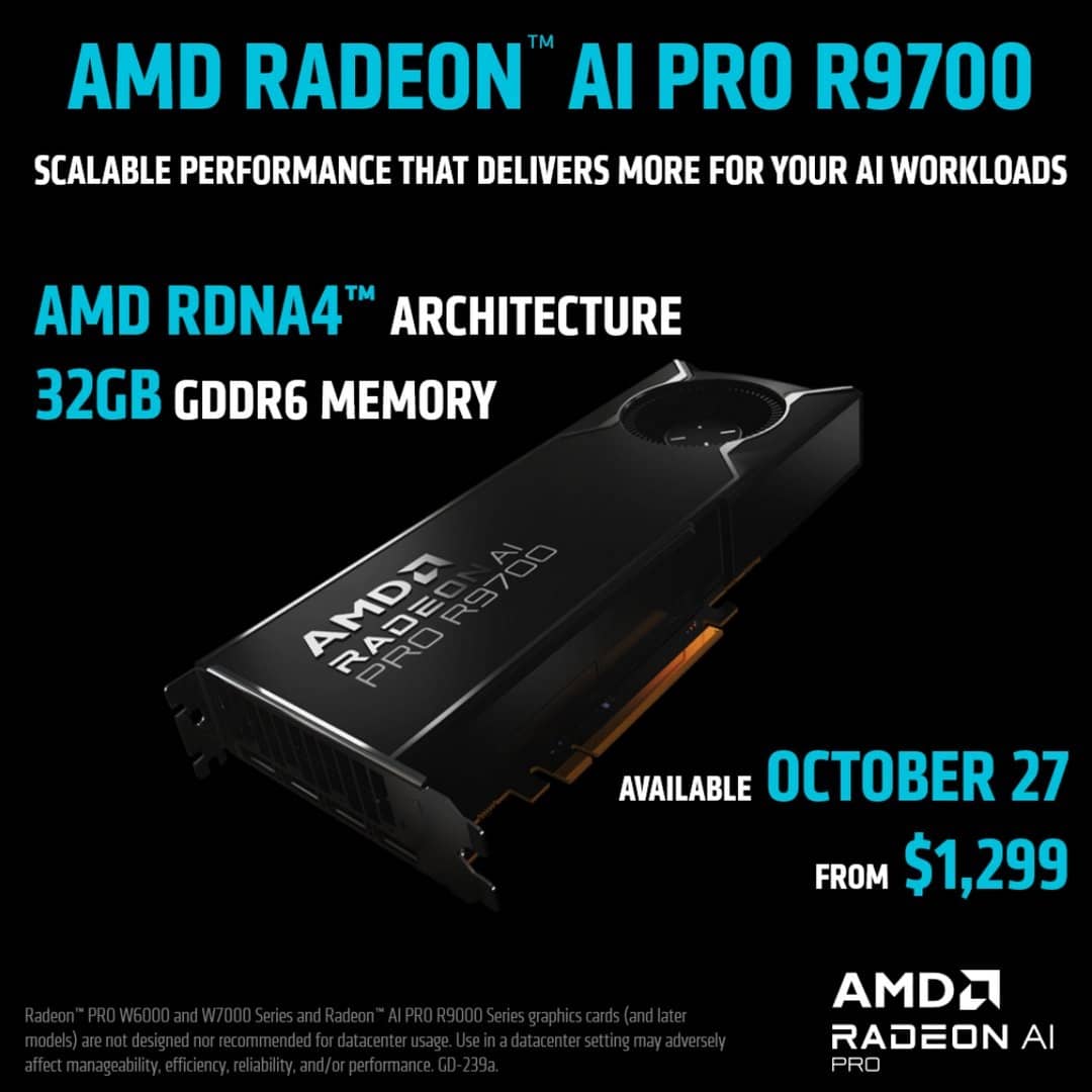 AMD официально подтвердила: Radeon AI Pro R9700, самая мощная графическая карта на архитектуре RDNA 4, поступит в продажу 27 октября по цене $1299. Модель позиционируется как рабочее решение для локальных AI-нагрузок, способное запускать крупные модели прямо на рабочей станции без обращения к дата-центру.