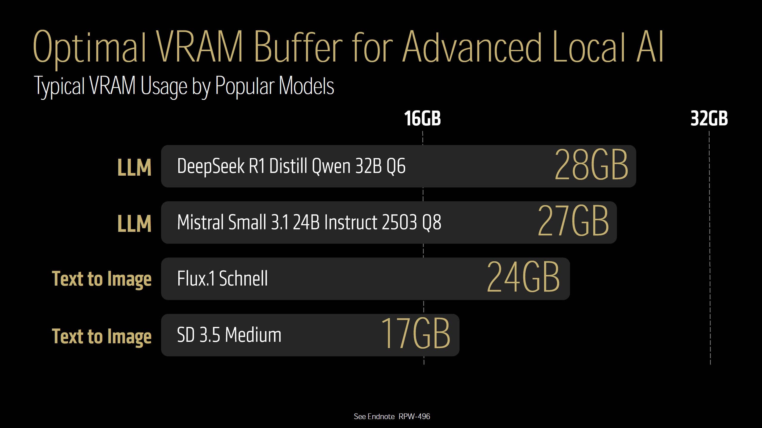 По данным AMD, Radeon AI Pro R9700 обеспечивает вдвое более высокую производительность, чем W7800, в задачах вроде DeepSeek R1 и Flux.1 Schnell. На графике использования VRAM видно, что модели DeepSeek R1 Distill Qwen 32B Q6 и Mistral Small 3.1 24B требуют 27–28 ГБ памяти, тогда как Flux.1 Schnell — около 24 ГБ, что подчёркивает оптимальность 32 ГБ буфера для продвинутых AI-сценариев.