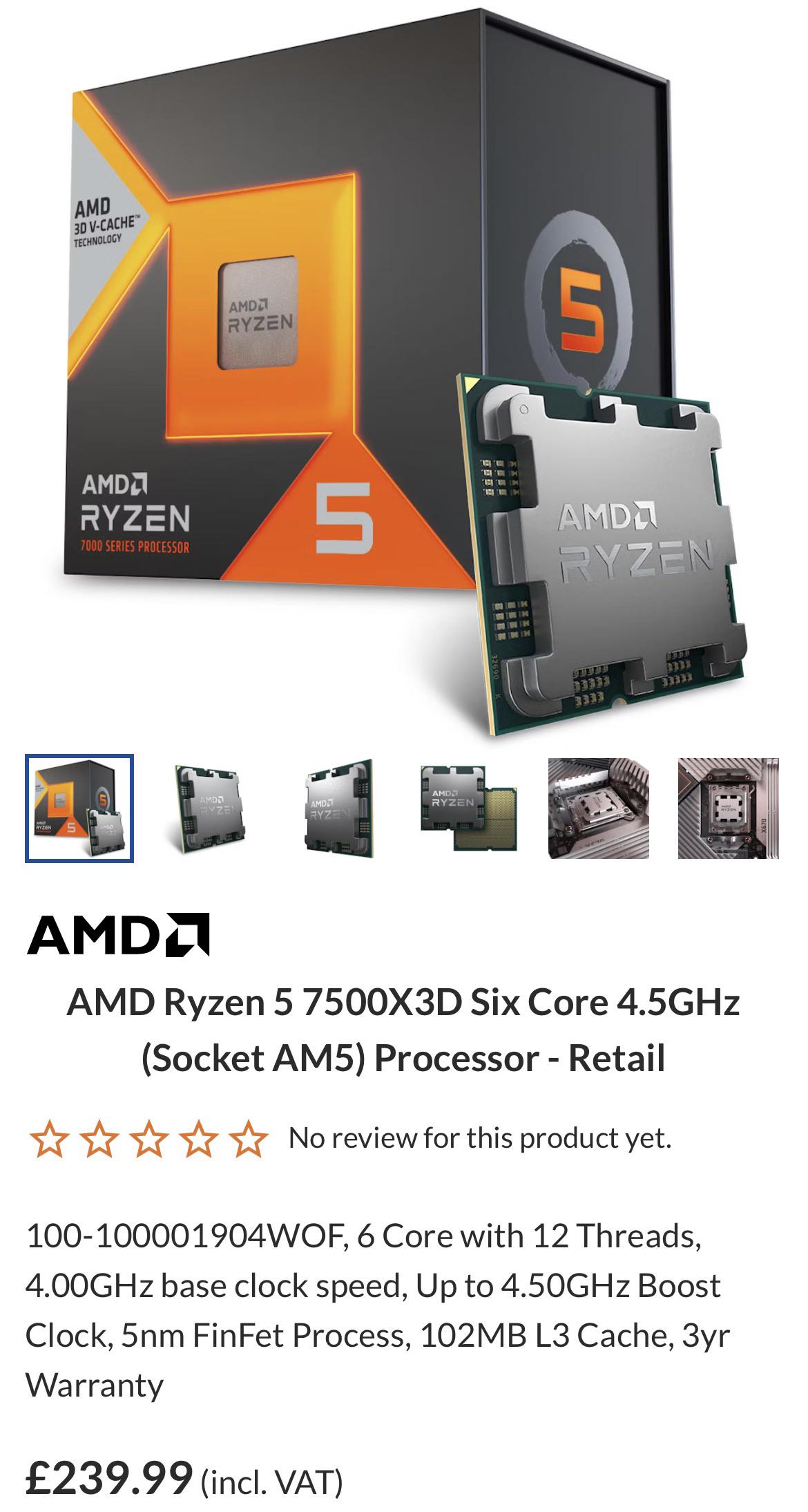 Недавно анонсированный Ryzen 5 7500X3D уже был замечен в розничных магазинах Великобритании. Это 6-ядерная модель с технологией 3D V-Cache для платформы AM5, однако ее цена вызвала удивление в сообществе.