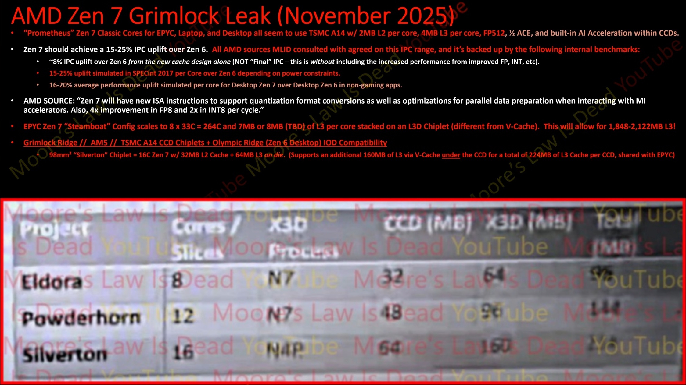 Появилась новая порция слухов от инсайдера Moore's Law is Dead, раскрывающая планы AMD на архитектуру Zen 7. Эти процессоры под кодовым названием "Grimlock Ridge" ожидаются в 2027-2028 годах. Самая шокирующая деталь утечки: по данным инсайдера, Zen 7 продолжит использовать сокет AM5. Если это правда, AM5 станет беспрецедентно долгоживущей платформой, поддерживающей три поколения процессоров: Zen 5, Zen 6 ("Olympic Ridge") и Zen 7 ("Grimlock Ridge").