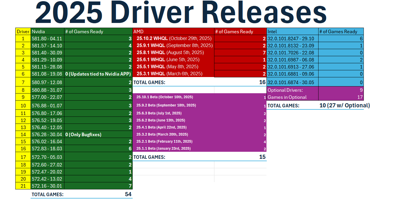 В сети появилось детальное сравнение стратегий выпуска графических драйверов тремя ведущими производителями — Nvidia, AMD и Intel — за 2025 год. Анализ, основанный на данных из официальных источников и баз данных, учитывал как WHQL-сертифицированные, так и опциональные/бета-версии драйверов, а также количество новых игр, получивших официальную поддержку "Game Ready".