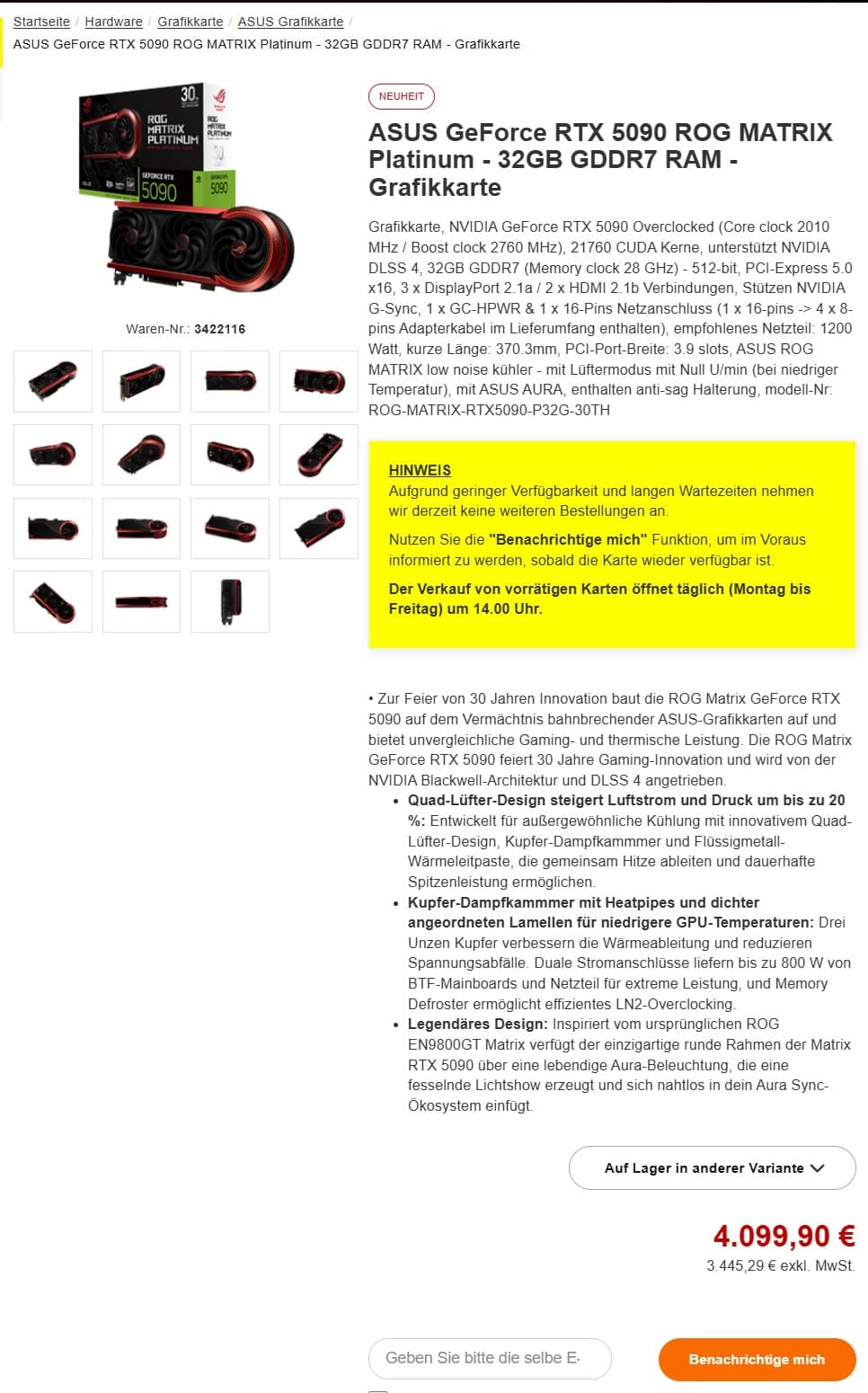 ASUS ROG Matrix RTX 5090 выйдет по ошеломляющей цене €4099