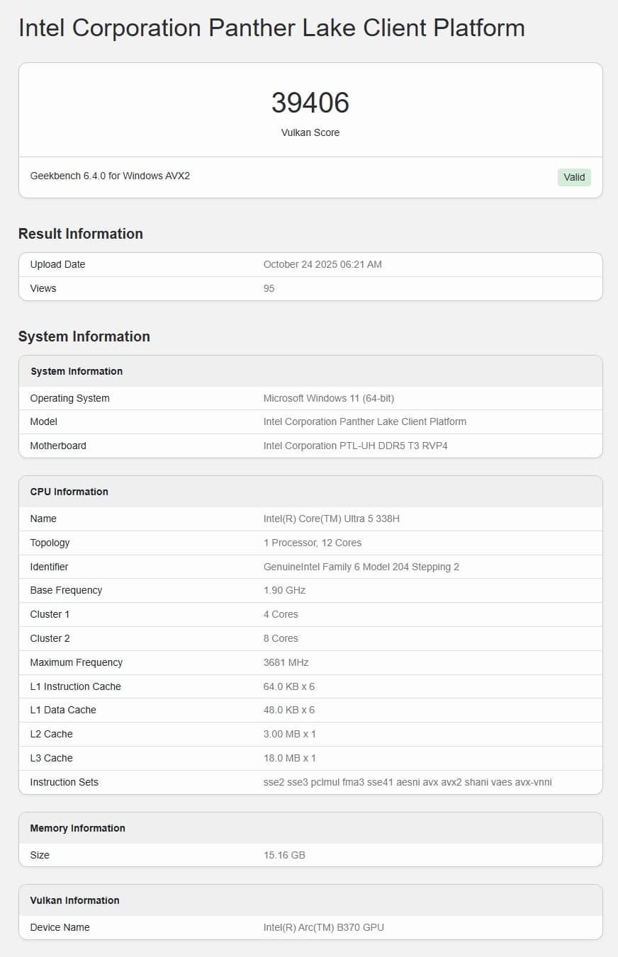 Бюджетный представитель линейки Panther Lake — процессор Intel Core Ultra 5 338H — прошёл тестирование в Geekbench 6.4.0, где его встроенная графика Arc B370 набрала 39 406 баллов в Vulkan-тесте, приблизившись к уровню AMD Radeon 880M. Это подтверждает, что даже младшие чипы архитектуры Panther Lake-H смогут предложить солидную производительность в графических задачах без дискретного GPU.
