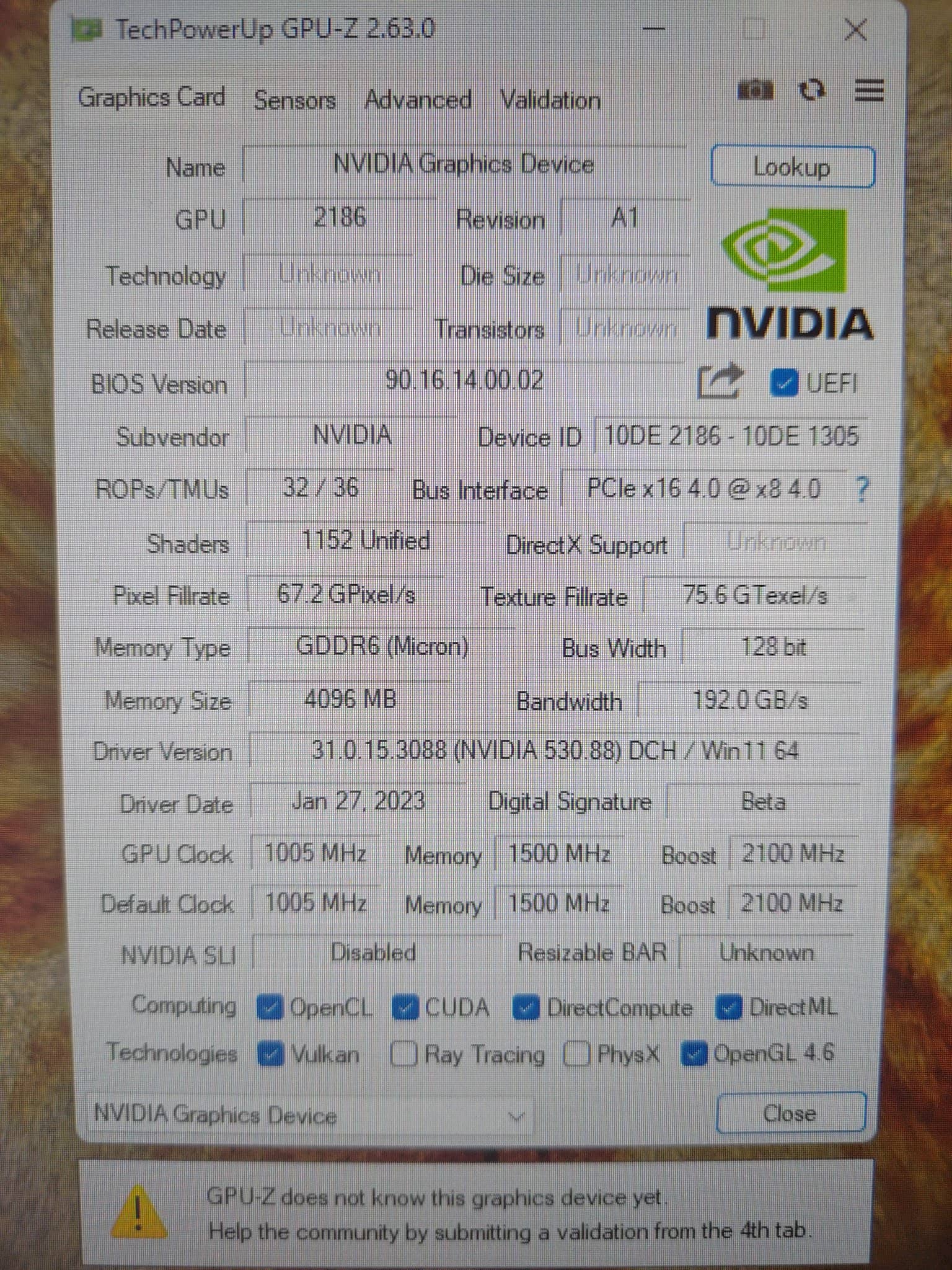 Согласно утилите GPU-Z, устройство определилось как NVIDIA Graphics Device с Device ID 10DE 2186, содержит 1152 ядра CUDA, 4 ГБ памяти GDDR6 от Micron и работает на шине 128 бит с пропускной способностью 192 ГБ/с. Частоты GPU достигают 1005 МГц (базовая) и 2100 МГц (boost), что может указывать на экспериментальный BIOS. Указанная поддержка DirectML, CUDA, OpenCL и Vulkan подтверждает полнофункциональную архитектуру Turing.