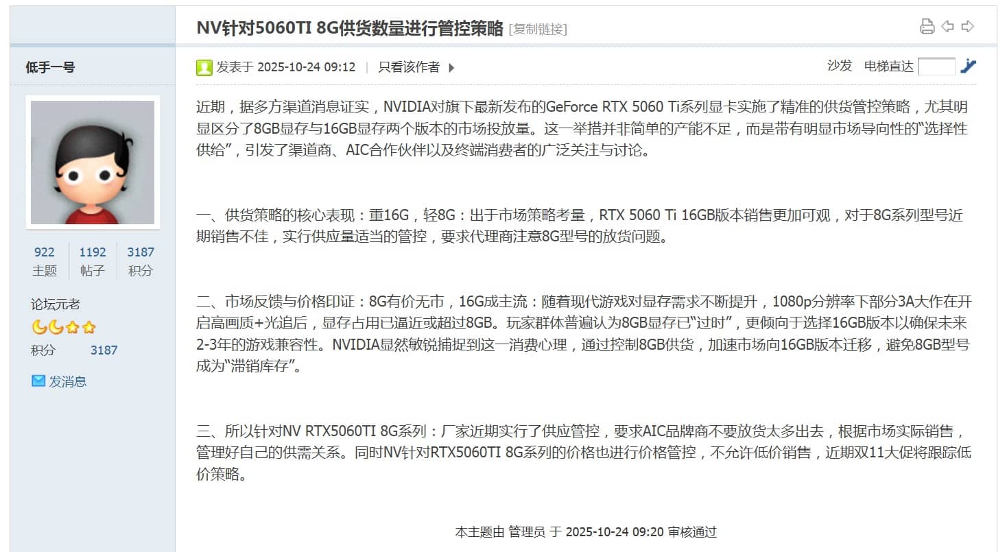 Согласно утечкам с китайских форумов, NVIDIA внедрила стратегию контроля поставок для линейки GeForce RTX 5060 Ti, особенно для версии с 8 ГБ видеопамяти. Источники сообщают, что компания целенаправленно ограничивает объёмы поставок младшей модели, чтобы сместить внимание рынка в сторону варианта с 16 ГБ. Решение затрагивает партнёров AIC и дистрибьюторов, которым предписано регулировать складские запасы и не накапливать 8-гигабайтные карты.