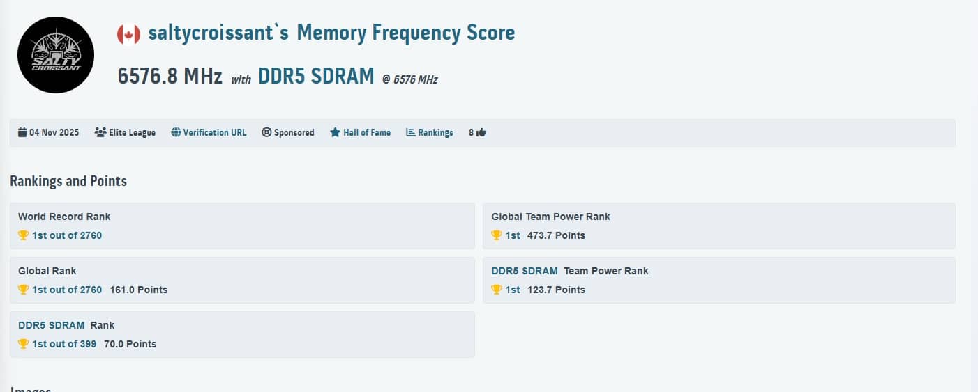 Оверклокер saltycroissant 4 ноября 2025 года установил новый мировой рекорд по частоте оперативной памяти DDR5. Ему удалось добиться работы модулей на реальной частоте 6576.8 МГц, что соответствует эффективной скорости DDR5-13153.6. Этот результат был зафиксирован в базе данных HWBOT и занял первое место в рейтинге.