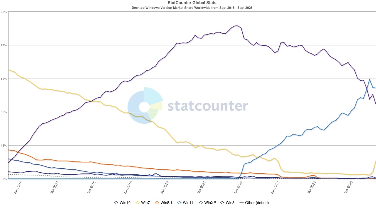 Сервис Statcounter опубликовал свежую статистику использования версий Windows за сентябрь 2025 года. Доля Windows 10 на рынке снизилась до 40,5%, что стало самым низким показателем за последние семь лет. Это падение происходит за две недели до окончания официальной поддержки операционной системы, запланированной на 14 октября 2025 года.