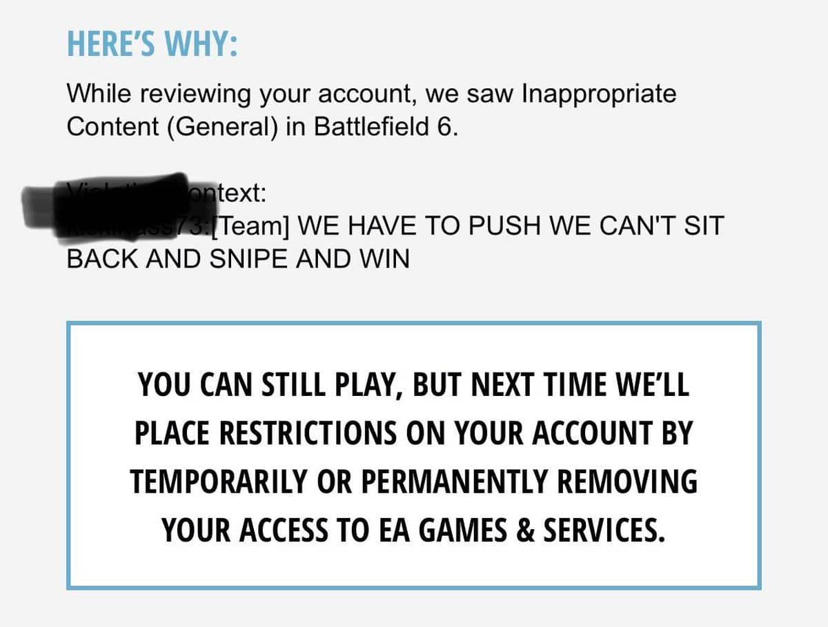 Игрок Battlefield 6 получил официальное предупреждение от EA за фразу в командном чате, которую система посчитала «неприемлемым контентом». Сообщение «WE HAVE TO PUSH WE CAN'T SIT BACK AND SNIPE AND WIN» было расценено как нарушение правил, несмотря на то что оно относится к типичной тактической коммуникации в матчах.
