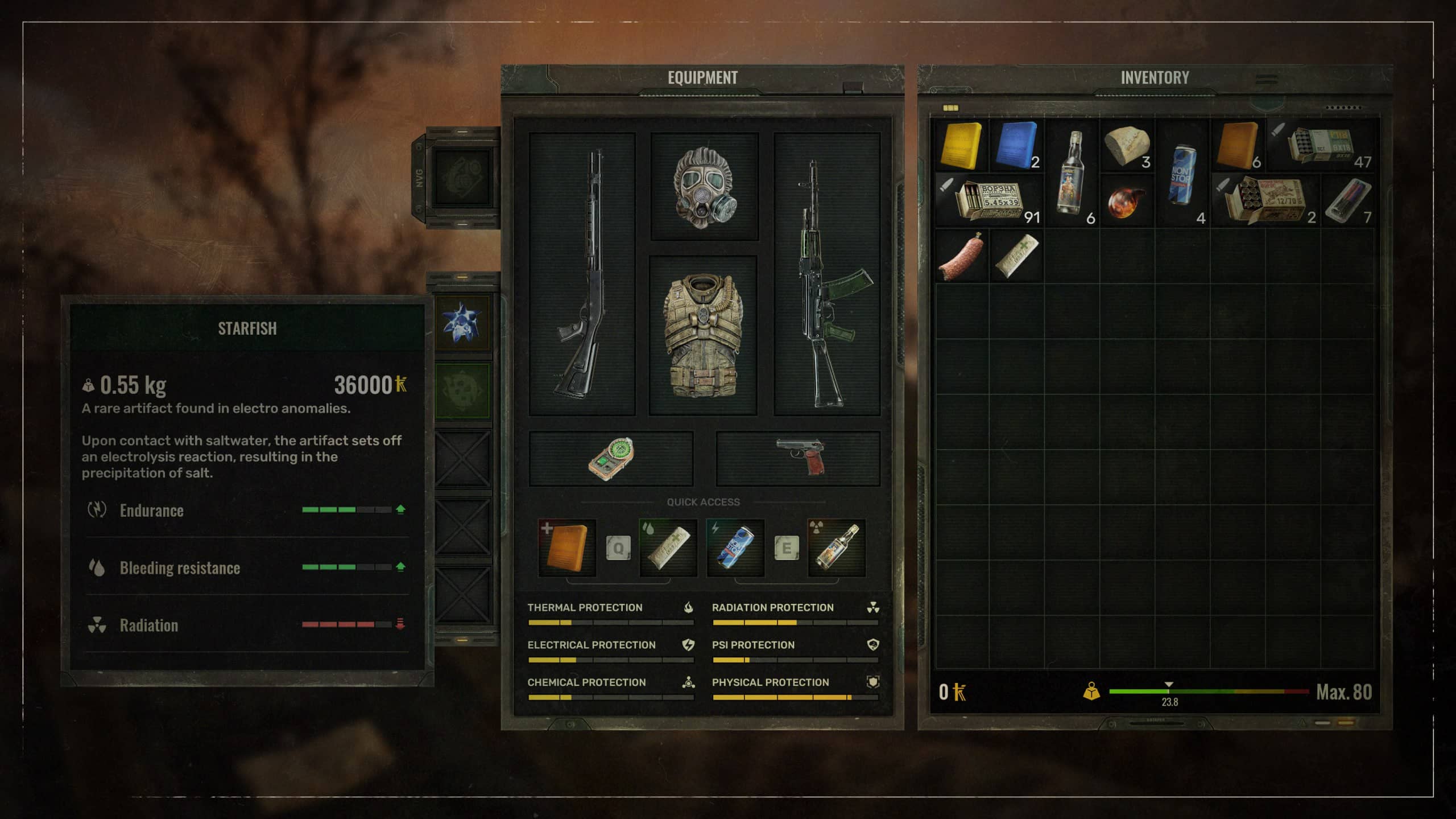 Кроме того, долгожданную детализацию получили характеристики артефактов и расходников. На скриншоте в качестве примера показан артефакт «Морская звезда» (Starfish) весом 0.55 кг и стоимостью 36000К. В описании четко видны его свойства: он повышает выносливость и сопротивление кровотечению, но в качестве негативного эффекта повышает уровень радиации у персонажа.