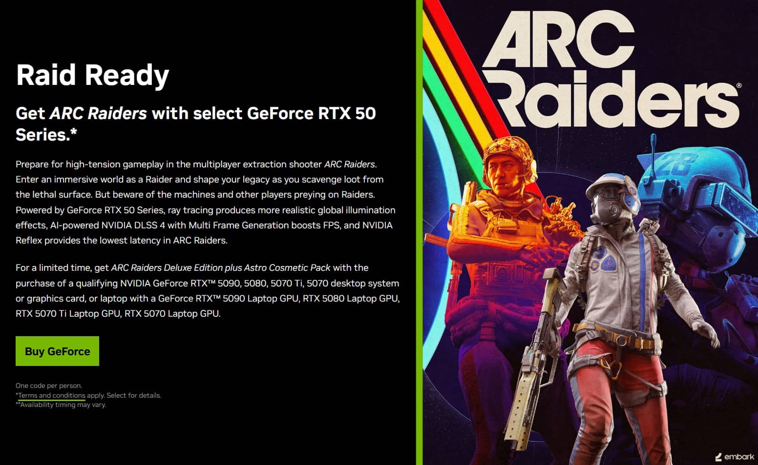 омпания NVIDIA запустила новую акцию: при покупке видеокарт серии GeForce RTX 50, включая RTX 5090, 5080, 5070 Ti и 5070, а также ноутбуков на базе этих GPU, пользователи получат ARC Raiders: Deluxe Edition и набор Astro Cosmetic Pack. Предложение ограничено по времени и доступно для систем и ноутбуков с соответствующими GPU.