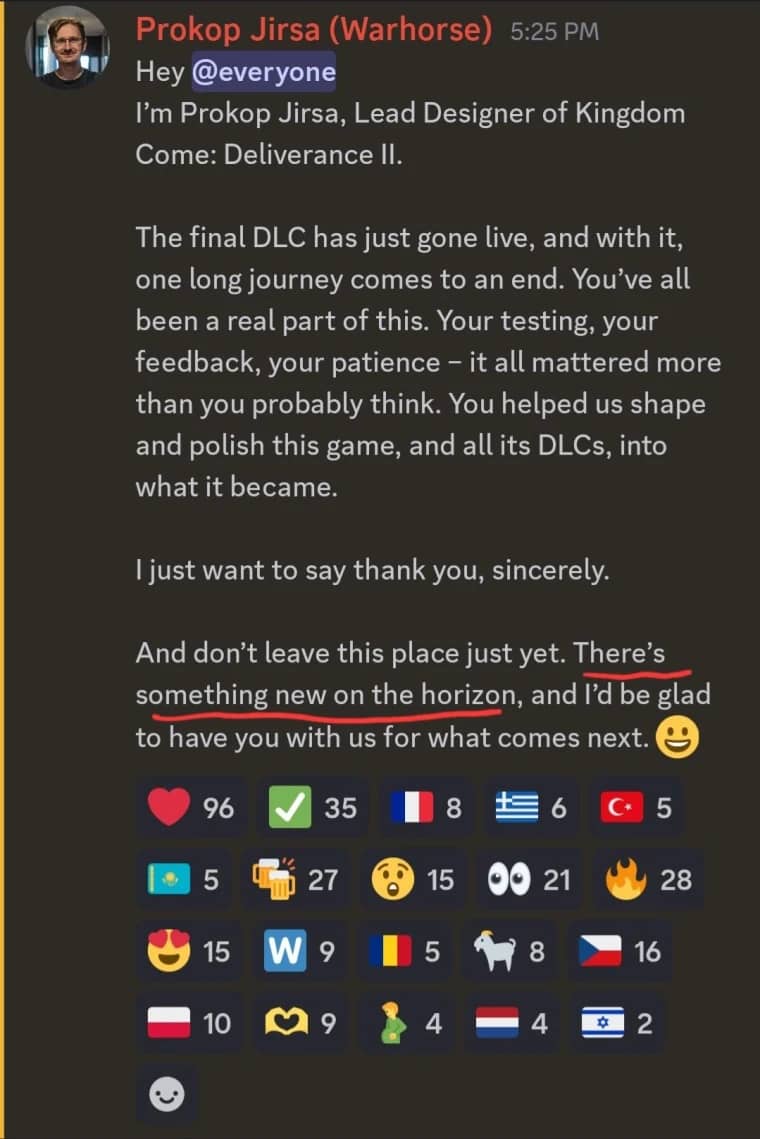 Студия Warhorse, похоже, уже вовсю работает над своим следующим проектом. Ведущий дизайнер Kingdom Come: Deliverance 2 Прокоп Йирса официально объявил в Discord о выходе финального DLC для игры, завершив тем самым ее "долгое путешествие".