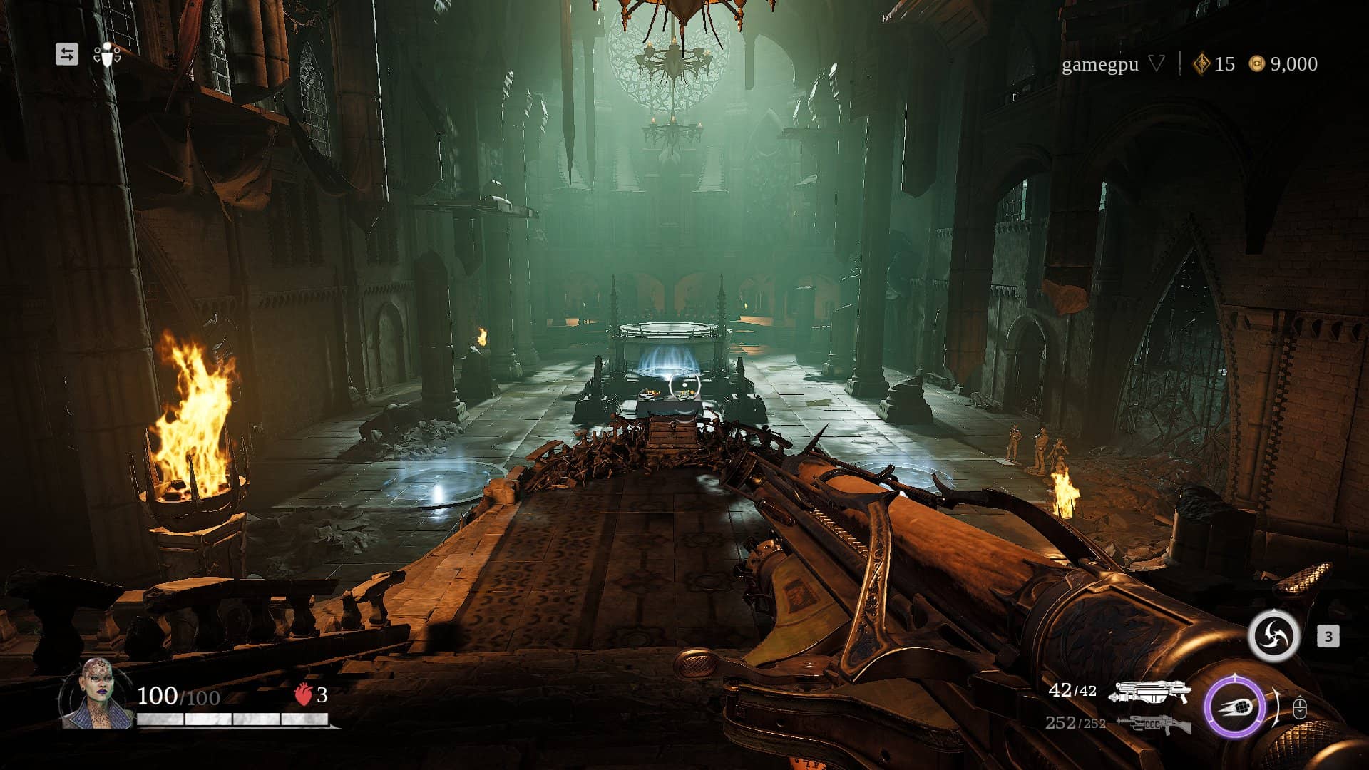 На минимальных настройках Painkiller сохраняет быстрый темп и мрачную атмосферу, но с заметным снижением визуальной глубины. Освещение статичное, текстуры плоские, а эффекты дыма, крови и частиц значительно упрощены. Тени отсутствуют или рендерятся в низком разрешении, отражения неактивны, а общее восприятие напоминает классические версии шутера без современных улучшений.
